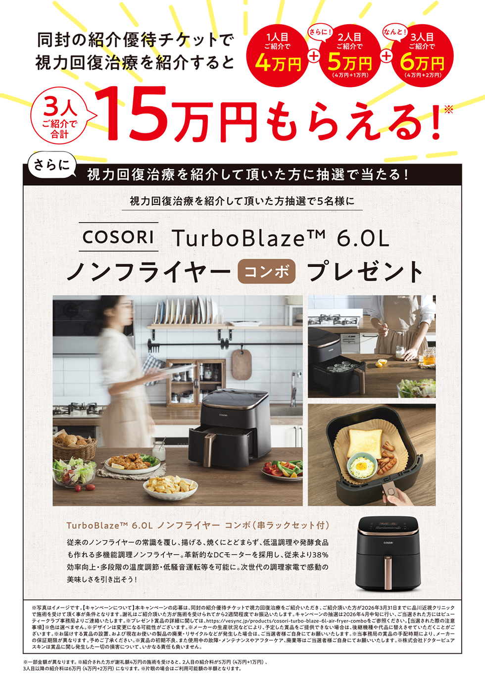 本キャンペーンの応募は、同封の紹介優待チケットで視力回復治療をご紹介いただき、ご紹介頂いた方が2026年3月31日までに品川近視クリニックで施術を受けて頂く事が条件となります。謝礼はご紹介頂いた方が施術を受けられてから2週間程度でお振込いたします。キャンペーンの抽選は2026年月4中旬に行い、ご当選された方にはビューティークラブ事務局よりご連絡いたします。